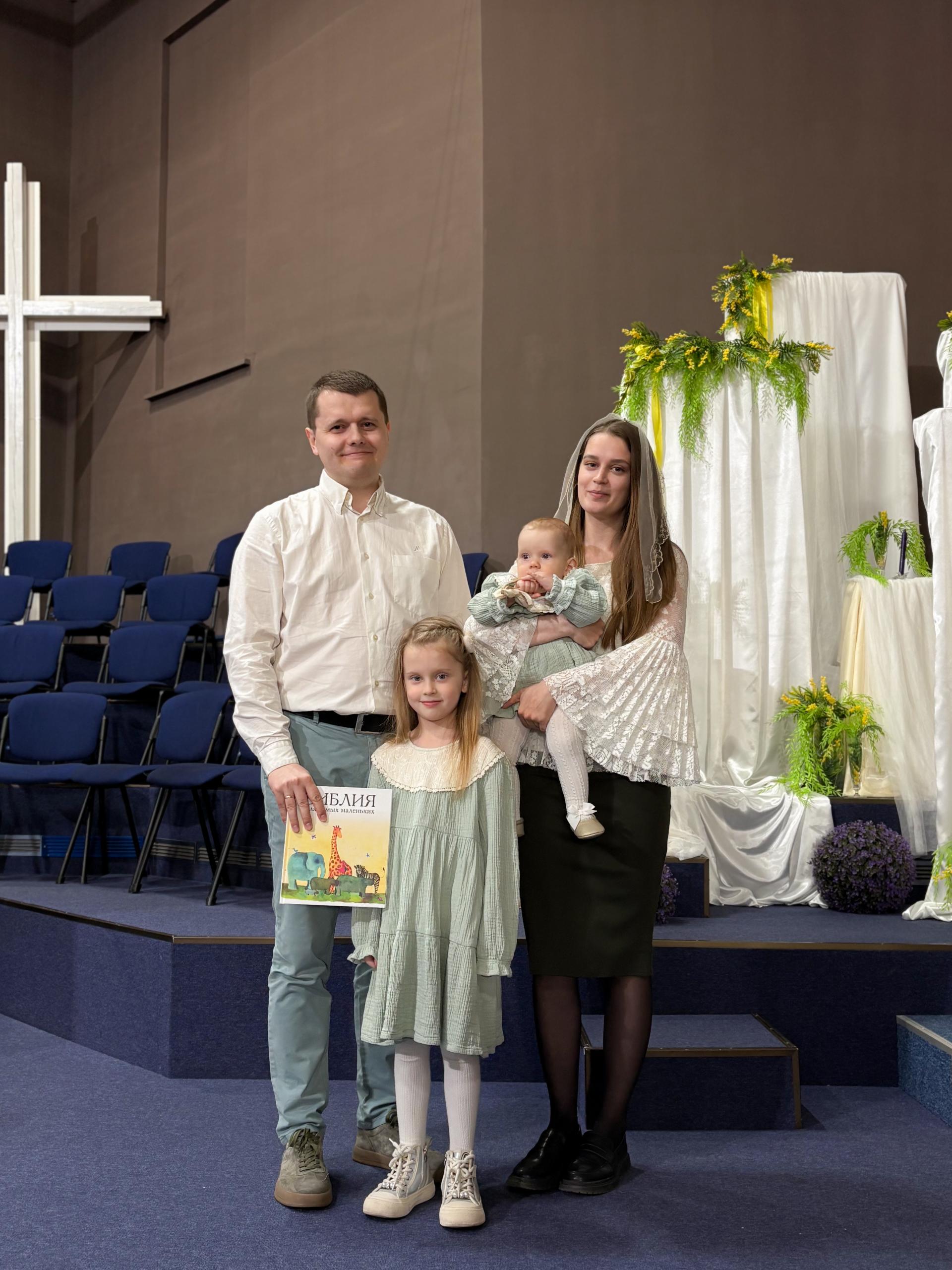 Сначала родители склонились в молитве и молились Богу за свою доченьку, прося особого водительства на всю её жизнь. Затем пастор возложил руки на Милану и вместе со всей церковью молился за девочку, а также за всю их семью.